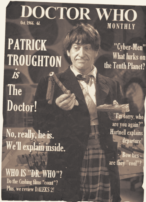 I always thought it was a shame that, although the classic “so-and-so is The Doctor!” covers have become a Doctor Who Magazine tradition ever since the Peter Davison (sorry, Davidson) one in 1981, the previous four Doctors never got their chance to have an equivalent. I mean, imagine how great it would look to have all eleven alongside one-another! Better than it does with the first four conspicuously absent, anyway.